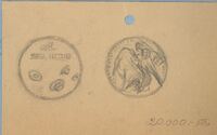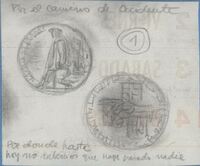 Boceto de una medalla para el V Centenario del Descubrimiento de America. "LA IDEA DE COLON" nº 1 Boceto a lápiz del reverso y anverso de una medalla, con las anotaciones a lápiz de las leyendas correspondientes a cada cara de la medalla. Parece poder leerse “por el camino de occidente”.1ªmedalla anverso-reverso del V Centenario del descubrimiento de america, título: LA IDEA DE COLON para Numismatica Iberica. OTROS ARCHIVOS:Mbo/383+394+429 MEN/1782 MG/1528