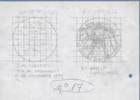 Boceto de una medalla del V Centenartio del descubrimiento de América Boceto a lápiz sobre fondo cuadriculado de las caras de una medalla en cuyo anverso se aprecia una multitud de trazos negros en diferentes direcciones, en el reverso de la medalla el dibujo de un grupo de figuras solo delimitadas por trazos sin ningún detalle.Para Numismatica Iberica medalla del V Centenario del descubrimiento de America la nº 13 "El Regreso" OTROS ARCHIVOS: MBr/1347-MBO/455 y 456