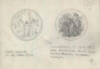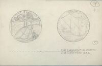 Boceto de una medalla para el V Centenario del descubrimiento de America. Boceto a lápiz de las caras de una medalla en cuyo anverso y reverso se aprecian trazos rápidos y sueltos que no se pueden identificar correctamente debajo de uno de los bocetos se puede apreciar las anotaciones a lápiz del autor donde se lee”Islas Canarias 9 de Agosto y 6 de Septiembre de 1492”.con el nº 7 para Numismatica Iberica. OTROS ARCHIVOS RELACIONADOS: MBO/442+443 MBR/1334