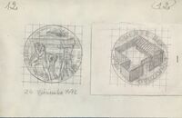 Boceto de una medalla de la serie V Centenario del Descubrimeinto de América Boceto a lápiz sobre fondo cuadriculado de las caras de una medalla que relatan lo sucedido en un fuerte en 1943, en el primer dibujo se aprecia la estructura de madera del Fuerte de Navidad en llamas, debajo las letras a lápiz donde se lee “Fuerte de Navidad, 27 de Noviembre de 1493”, y al lado el dibujo las figuras de dos hombres tumbados bocaarriba con anotaciones escritas donde se lee “halló quemada la torre y los castellanos muertos”.realizadapara Numismatica Iberica es la nº 18 de la serie del. OTROS ARCHIVOS: mbo/466+467 MBR/1357
