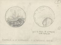 Boceto de una medalla para el V Centenario del descubimiento de America, nº8 Boceto a lápiz de las caras de una medalla en cuyo anverso se dibuja la figura de un hombre tumbado y de fondo unos barcos de vela y en el reverso la cabeza de una figura que mira el vuelo de unas gaviotas debajo se puede leer las anotaciones a lápiz del autor “Así lo habría de proseguir hasta hallarlas y travesía 6 de Septiembre - 11 Octubre de 1492”.Nº 8 medalla V Centenario del descubrimiento de america realizada para Numismatica Iberica. OTROS ARCHIVOS: MBO/400 "Otra propuesta"
