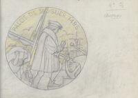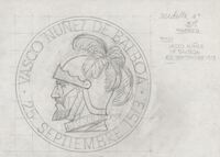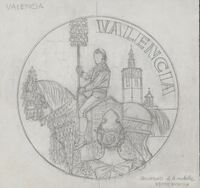 Boceto de una medalla Valenciana Boceto a lápiz del anverso de una medalla representativa de la ciudad de Valencia, con la imagen en primer término de un jinete sujetando un estandarte sobre un caballo vestidos y engalanados con ropajes típicos de la zona.Para AcuñacionesEspañolas