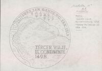 Boceto del anverso de la medalla nº 22 seri V centenario del descubrimiento de América. Boceto a lápiz del anverso de la medalla número veintidós, con la imagen de un mapa gigante correspondiente al nuevo continente junto a la figura de una flota de barcos que se acercan, con la leyenda que dice “Tercer viaje al continente 1498”.para Numismática Iberica OTROS ARCHIVOS: MBR/1364 (anverso reverso) MBO/421+476