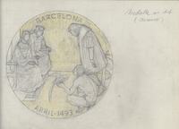 Boceto del anverso de la medalla nº 5. -V centenario del descubrimiento de América "Capitulaciones de Santa Fé" Boceto a lápiz sobre fondo claro del anverso de la medalla número cinco donde se representa a Cristóbal Colón con gesto de reverencia ante la Reina Isabel La Católica sentada y extendiendo en su mano la orden para emprender el viaje, alrededor de la escena ocupando el perfil de la medalla se lee “por nuestro mandado vade a descubrir e ganar.”Serie realizada para Numismatica Iberica. Anverso Otros Archivos: MBR/1342 anv. Revrs. MEN/1767 + 1768