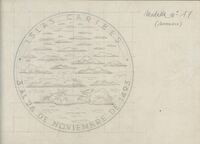 Boceto del anverso de la medalla nº 17 serie V centenario del descubrimiento de América. Boceto a lápiz del anverso de la medalla número diecisiete, donde ocupando todo en el campo de la superficie se aprecia un conjunto de islas en el océano, junto a las letras “Islas Caribes, 3 al 26 de Noviembre de 1493.”Para Numismática Ïberica serie V centenario… …. Otros Archivos: MBO/409+465 MBR/1358