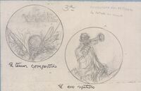 Conquista del desierto                Boceto a lápiz de las medallas relacionados con la temática de la conquista del desierto, una de ellas titulada “el temor compartido” con la imagen de la cabeza de un indio agazapado observando el paso de una tropa de soldados americanos, junto al dibujo de otra medalla titulada “el eco repetido” con la figura de un soldado a caballo tocando la corneta.