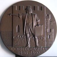 Corte de Castilla 1486 - 1492 Nº 4 -V centenario deldescubrimiento de América (anverso                Fotografía de la cara de una medalla con la imagen central de Colón de perfil con el brazo extendido hacia una dirección concreta cuyo fondo aparece la fachada de un castillo en cuyo pared se aprecia las cabezas de una multitud de personas.Para Numismatica Iberica. OTROS ARCHIVOS RELACIONADOS: MBO/393+435+436 MEN/1779 MBR/1336