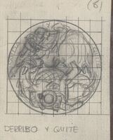 Derribo y quite                Boceto a lápiz con fondo cuadriculado, del derribo de un picador y su caballo por la embestida del toro, y la imagen de un toro que sale al quite para salvar la situación, con apuntes a lápiz del título y la numeración: “(8)”.