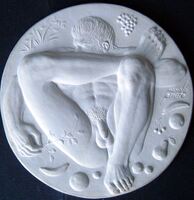 Desnudo                Molde de escayola de la cara de una medalla donde se aprecia la figura de un hombre desnudo sentado plácidamente rodeado por elementos decorativos frutales.