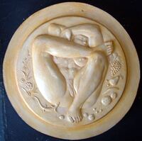 Desnudo                Molde de escayola del negativo de la cara de una medalla donde se aprecia a una mujer desnuda con una de las piernas apoyada en la otra dejando ver sus partes más íntimas junto a una lagartija y decoración frutal.