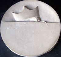 Cortes de Castilla nº 4                Molde de escayola del negativo de la cara de una medalla con la imagen en primer término de colón señalando a un punto concreto sobre la fachada principal de un castillo donde sea precia las cabezas de una multitud de gente.Para Numismática Iberica, anverso. OTROS ARCHIVOS RELACIONADOS: MBO/393+435+436 MG/1532 MBR/1336