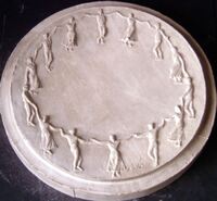 Corro de baile                Molde de escayola de la cara de una medalla donde contorneando todo el perfil de la superficie se aprecia un corro de personas unidas por sus manos bailando, como en una especie de baile de paz.
