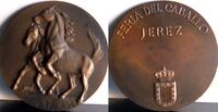Feria del Caballo en Jerez Fotografía de las caras de una medalla representativa de la Feria del caballo de Jerez, con la imagen de unos caballos, en primer término uno de ellos con las patas delanteras levantadas junto al reverso donde se lee la leyenda y el escudo correspondiente.