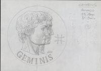 Géminis Boceto a lápiz del anverso de la medalla correspondiente al signo géminis, representado por la composición de perfil de dos retratos masculinos de rasgos equilibrados del mundo griego, junto a la medalla anotaciones a lápiz del autor.