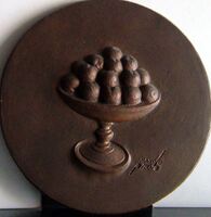 Frutero Fotografía de un bellísimo bajorrelieve de una medalla donde se aprecia muy centrado en la medalla un sencillo frutero lleno de un tipo de fruta, que, aunque no lo podemos asegurar, pensamos que son manzanas.