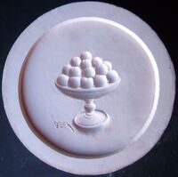Frutero Molde de escayola del negativo que puede apreciarse por estar la firma al revés) de la cara de una medalla donde se aprecia como figura central y única un frutero lleno de manzanas.