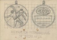 Federación internacional de pelota Vasca Boceto sobre fondo cuadriculado de las caras de una medalla representativa de la Federación internacional de pelota vasca, en el anverso el dibujo de dos hombres jugando a la pelota vasca junto al reverso donde se aprecia la figura de un símbolo junto a las letras “cesta punta”.
