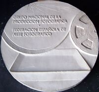 Federación Española de Arte Fotográfico Molde de escayola del negativo de una medalla donde se aprecia un rollo de una película fotográfica extendida sobre una cubeta junto a la leyenda correspondiente del grupo nacional al que corresponde.