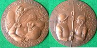 Fue el doloroso nacimiento del pueblo mestizo En ambas medallas se representan figuras. En la primera una mujer está tumbada y desnuda. En la segunda dos personajes agarran una lanza. Tanto las figuras como las palabras que hay están en alto relieve. Solamente la medalla de la izquierda está firmada.
