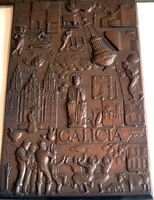 Galicia Fotografía de una placa de bronce representativa de Galicia, con la figura central de Santiago Apóstol junto a iconografía significativa de la región, entre los que se ve un cura bajo a un paraguas.Otros archivos: MBO/330 MEN/1321