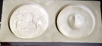 Gallos de pelea y sombrero Fotografía de dos moldes de escayola donde en uno de ellos se representa la pelea de dos gallos junto al molde de un sombrero con un cosido en aspa en el ala típico del pais mexicano.
