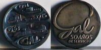 Gal Fotografía de las caras de una medalla conmemorativa de la Empresa Gal, en una de sus caras entre el rótulo de la marca representativa con diferentes edificios que van aumentado de tamaño simulando el crecimiento de la empresa en los distintos años, junto al logotipo de la marca y los años de aniversario.
