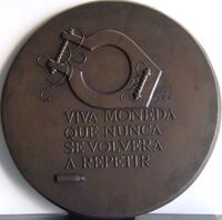 GARCIALORCA (reverso) Fotografía de la cara de una medalla, donde se aprecia una lira con las cuerdas rotas (donde a aprovechado el artista para firmar) junto a la leyenda que dice”Viva [la] moneda que nunca se volverá a repetir”.Sin mas referencias. Otros Archivos.: MBO/518