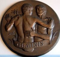 Géminis Fotografía de la cara de una medalla donde se aprecia el bajorrelieve con la imagen de dos hombres fundidos en un abrazo rodeados por la cartela correspondiente al signo del zodiaco que representa.Otros Archivos: Mbo/310
