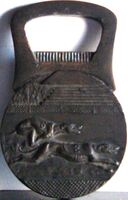 Galgos Fotografía de un abrebotellas metálico con una escena que representa a dos galgos corriendo en plena carrera donde de fondo se aprecia las gradas del recinto donde se celebra.
