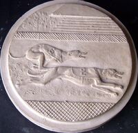 Galgos Molde de escayola de una medalla donde se representa a dos galgos en plena carrera junto ala valla del recinto que deja ver las gradas en donde se celebra la competición canina.