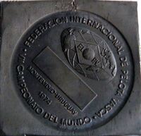 Federación Internacional d Pelota Vasca Fotografía de la cara de una medalla conmemorativa del Campeonato del mundo de Pelota Vasca cuya leyenda se encuentra en el perfil de la medalla en el centro una bola del mundo con una pelota y debajo una cartela rectangular vacía.