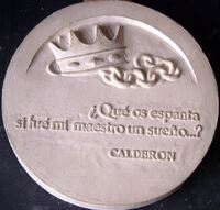 La vida es sueño. Molde en positivo de escayola de una medalla donde se aprecia la figura de una corona junto a una cadena y un párrafo de la obra de “La vida es sueño” de Calderón de la Barca.