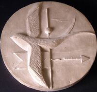La Veleta Molde de escayola del positivo de una medalla que representa la escena de un pájaro con las alas abiertas volando –con sus posibles connotaciones simbólicas- en dirección contraria a veleta.
