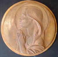 La Virgen Niña Molde de escayola, con barniz de goma laca, de la cara de una medalla con la imagen de perfil de la Virgen niña.