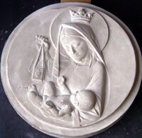 La Virgen con el Niño Molde en positivo de escayola de una medalla donde se aprecia la figura de la Virgen María con el Niño Jesús en brazos enseñándole un escapulario del Sagrado Corazón con la mano.