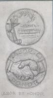 Labor et Honor Boceto a lápiz de las caras de una medalla representativa del trabajo y el honor, en donde en una de ellas se aprecia el apretón de manos como signo de acuerdo bajo la leyenda Labor et Honor.
