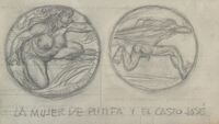 La Mujer de Putifa y el casto José, boceto Boceto a lápiz de las caras de una medalla donde el anverso se aprecia el dibujo de una mujer desnuda que sujeta desesperada la túnica de José que huye despavorido ante la tentación imagen representada en el reverso de la medalla.Para el, realizo una serie denominada "Serie erotica."boceto de futura medalla "La mujer de Putifa y el Casto José