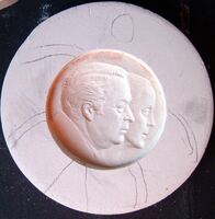 Manolo Prieto y su mujer Molde de escayola del negativo de la cara de la medalla conmemorativa de las Bodas de Plata de Manolo Prieto, con los perfiles de él y su mujer.