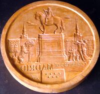 Madrid Molde de escayola del negativo de una medalla de la Comunidad de Madrid en primer término la escultura ecuestre de un rey Borbón junto a una pareja de chulapos bailando el chotis y un oso encaramado a un madroño símbolo del escudo de la capital.