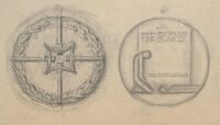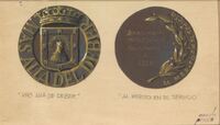 Más allá del deber y Al mérito en el servicio Dibujo a color de dos medallas cuyos títulos están a notados a lápiz, la medalla titulada más allá del deber está representada por la imagen de un escudo coronado y rodeado de letras inscritas, la otra medalla titulada al mérito en el servicio representa una hoja de laurel que ocupa uno de los laterales de la superficie de la medalla junto a las letras correspondientes.