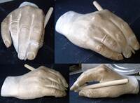 Mano Se presentan aquí cuadro fotografías, desde distintos ángulos, de una mano cogiendo un elemento afilado; posiblemente se trate de la mano del propio artista, cogiendo el lápiz o buril con el que trabajaba las medallas.
