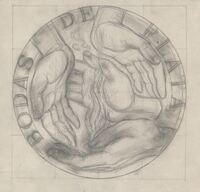 Medalla Bodas de Plata Boceto a lápiz de una de las caras de una medalla conmemorativa de unas bodas de plata, donde se representa un conjunto de manos alrededor de una llama de fuego, como protegiéndola.Para Numismática Iberica