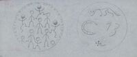Lotería Nacional Boceto a lápiz de la medalla representativa de la Lotería Nacional con dibujos esquemáticos, en una de las caras se aprecia a un grupo de hombres acompañados de sus hijos que ocupan todo el campo de la medalla junto al reverso con el número trece, una herradura y la silueta de un perro.