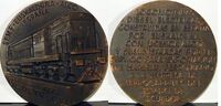 Locomotora Fotografía de una medalla representativa de locomotoras eléctricas fabricadas en España y comercializadas en el exterior, con la imagen de una locomotora junto al reverso donde viene inscrita la leyenda explicativa de la medalla.