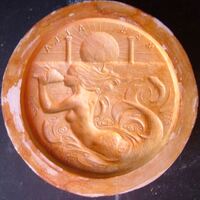 Más Allá Bajorrelieve de escayola, con barniz de goma laca, de la cara de una medalla titulada Más Allá, con la figura de una sirena en primer término con una concha y en la lejanía junto a dos columnas un una bola del mundo indicando que existe más mundo por descubrir.