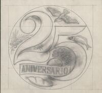 Medalla del 25 Aniversario "BODAS DE PLATA" Boceto a lápiz de una de las caras de una medalla conmemorativa del veinticinco aniversario, con la imagen de las números en grande donde debajo se aprecia una cartela con las letras aniversario y decoraciones vegetales y animales a su alrededor.Para numismatica Iberica. No nos entrego ninguna medalla que es el compromiso que tenía con Manolo Prieto