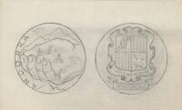 Medalla de Andorra. Boceto a lápiz de las caras de una medalla representativa de Andorra, en una de ellas la imagen de una gran mano que ocupa el campo de la medalla en cuyo fondo se aprecia la silueta de un conjunto montañoso junto al boceto de la otra cara donde se aprecia el escudo de Andorra.Sin referencias