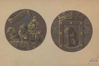 Medalla de un escudo de una provincia, un león y un águila Medalla con bajo relieves en bronce, compuesta por tres escenas, dos de ellas corresponden al anverso donde se representa un escudo de una provincia, y un relieve de un león que bajo su pata hay una bola y a ambos lados la imagen de una balanza donde se puede leer votos y leyes, y por último en el reverso la imagen del águila imperial.Boceto para presentar al cliente para su aprobación