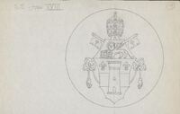 Medalla de un escudo Papal de JUAN XXIII Boceto a lápiz de un escudo coronado por la tiara papal y las llaves símbolo del reinado terrenal de la Iglesia en el mundo como representación y salvaguarda de la doctrina y enseñanzas de Jesús.Para la Casa de la Moneda, no se realizo este reverso