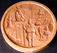 Medalla de una comunidad Molde de escayola del negativo de una medalla que representa a una comunidad con diferentes figuras características apreciando unos gusanos de seda en una hoja de morera, un penitente de Semana Santa, un hombre sobre un caballo junto a unas palmeras y demás elementos.